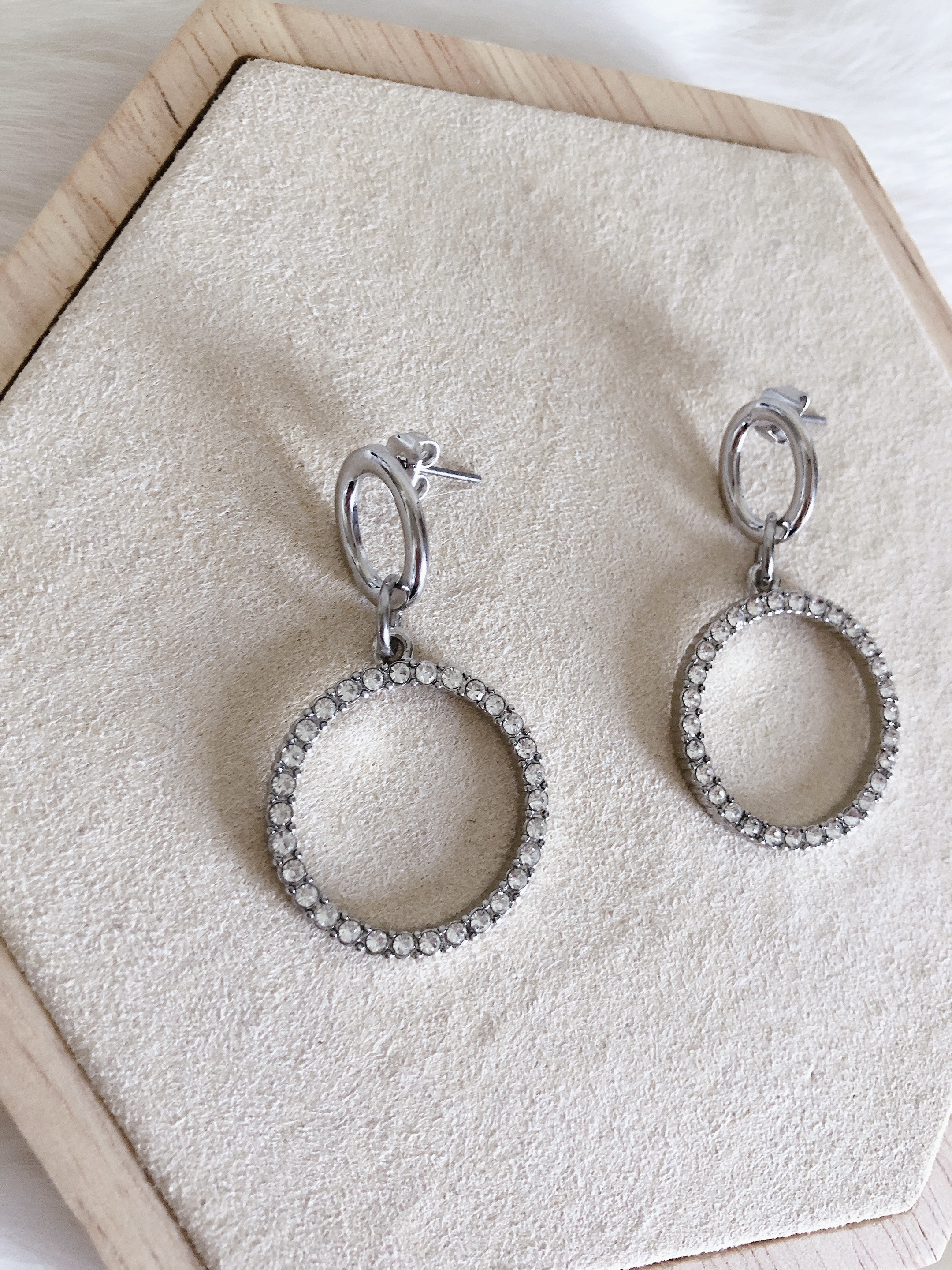 Deze oorbelletjes zijn echt feestlijk. De zilveren hangertjes bevatten witte strass-steentjes.
